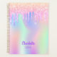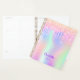 Um fundo holográfico de tendência, colorido, com cores pastel unicórnio e arco-íris, cor rosa e púrpura, verde. Decorado com pingos falsos em rosa e roxo. Personalize e adicione um nome, escrito com um script de estilo manuscrito, entre elas, moderno. Adicione um ano. Letras cor púrpura.