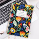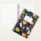 Personalize este planejador com seu nome em itálico preto enquadrado por um retângulo branco, em um padrão floral brilhante e colorido em um fundo preto.