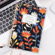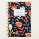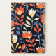 Personalize este planejador com seu nome em itálico preto enquadrado por um retângulo branco, em um padrão ousado e alegre de flores laranja e branca em um fundo preto.
