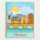 Um design planejador com cores brilhantes e atraentes, o mar azul, as nuvens e o sol, e edifícios laranja. É realmente maravilhoso e dá-vos alegria de começar a planejar o vosso dia enquanto se sentem felizes.