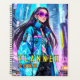 Uma estrela pop ao estilo anime futuralista fica no centro de uma cidade ciberpunk. Ela veste uma jaqueta azul clara e de alta tecnologia de grandes dimensões com padrões geométricos ousados, óculos escuros e acessórios futuristas. Design perfeito para adolescentes