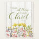 Planeador com verso de escrituras familiar dos Filippianos 4:13, "Eu posso fazer tudo através do Cristo" num estilo moderno, tipográfico com fundo de madeira clara e flores amarelas e cor-de-rosa ao longo da base. Concebido por Simplesmente Escritura; Arte floral a partir de Cortes de Design.