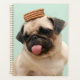 Pug dog com língua para fora e biscoitos na cabeça, fundo verde.