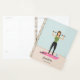 Este planejador mostra a ilustração de Destei de uma garota morena que está levantando os buracos leves. Ela está vestindo um tanque verde e leggings pretas. A garota está parada em um tapete de ioga rosa. Há uma garrafa de água azul atrás dela e mais alguns sinos pelos pés dela. Sob a menina há áreas de texto personalizáveis para o título do planejador.