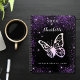 Fundo preto, texto branco. Decorado com brilho púrpura, faíscas e uma borboleta grande. Personalize e adicione um ano, seu nome e um título. O nome é escrito com um moderno estilo escrito à mão.