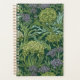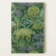 Seamless William Morris style wallpaper pattern featuring dense green foliage and large, rounded flowers in shades of lime green, off-white, and muted lavender against a dark emerald background.