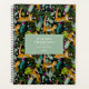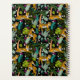 Uma bela ilustração desenhada à mão de um tigre da selva tropical numa selva botânica com flores exóticas, folhas, palma e flores silvestres. Este tigre de safari tropical temático design tem um fundo preto que cria uma cena de ânimo escuro. Um design ideal para quem ama animais selvagens, ilustrações de tigre e temas tropicais. Personalize este design de tigre tropical e faça dele seu!