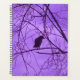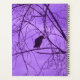 Este planejador tem a silhueta de um corvo preto sentado em galhos de árvores negras contra um céu roxo profundo na frente e atrás.