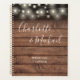 Elegante planejador de casamento personalizado com nomes de estilo em uma madeira rústica e luzes de cordas em segundo plano. Projetado por Thisnotme©