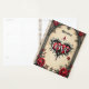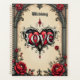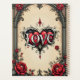 Um romance gótico. Um quadro em estilo gótico e ornamentado ao redor de um fundo bege. As rosas vermelhas com folhas verdes escuras são dispostas ao redor do quadro, principalmente nos cantos. No centro inferior, há um emblema decorativo em forma de coração com a palavra "LOVE" inscrita em uma fonte estilizada.
