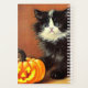 Planner com um gatinho branco e preto do Halloween! Este gatinho de olhos azuis se posou adoravelmente com uma abóbora esculpida. Um presente divertido para festas de Halloween e amantes de gatos!