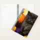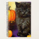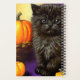 Planner com um gatinho de Halloween vintage! Um gatinho preto fluffy posou perto de abóboras contra um fundo roxo. Um presente divertido para festas de Halloween e amantes de gatos!