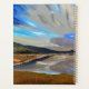Uma design de arte de um lago com o dramático céu refletido na água do lago. Colinas e campos circundam o lago.