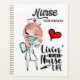 Uma enfermeira caucasiana branca de desenho animado com cabelo louro de morango com o ombro está segurando uma prancheta e vestindo uma máscara de proteção. Ela está segurando a mão em um sinal de paz e a inscrição, vivendo essa vida de enfermeira, lhe parece certa. São presentes perfeitos para mães, irmãs, filhas, netas, sobrinhas e melhores amigos que trabalham num hospital ou estudam para ser enfermeiras.