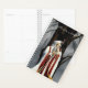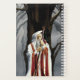 Um mago todo branco, vermelho e ouro está segurando um funcionarios com as duas mãos com um carvalho muito velho atrás dele e uma floresta ao redor. Um corvo preto está atrás dos ombros do bruxo.
