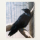 Um corvo preto sentado num galho. Inverno e floresta ao redor com neve caindo.