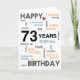 Que seu dia especial seja cheio de alegria, risos e momentos inesquecíveis que você pode apreciar por anos. Desejando-lhe toda a felicidade do mundo no seu aniversário e sempre! Descrição: o Vamos comemora o incrível marco de 73 anos com a nossa maravilhosa carta de aniversário de 73 anos! Seja para a sua querida mãe, pai amada, querido irmão, ou irmã amada, esta carta oferece uma bela avenida para expressar os seus desejos sinceros e chá-os de alegria e amor no seu dia especial. A frente do cartão mostra orgulhosamente "Parabéns" ao lado do número significativo 73, representado em décadas, anos, meses, semanas, dias, horas, minutos e segundos, destacando o significado desta ocasião importantíssima.