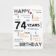 Que seu dia especial seja cheio de alegria, risos e momentos inesquecíveis que você pode apreciar por anos. Desejando-lhe toda a felicidade do mundo no seu aniversário e sempre! Descrição: o Vamos comemora o incrível marco de 74 anos com o nosso maravilhoso cartão de aniversário de 74 anos! Seja para a sua querida mãe, pai amada, querido irmão, ou irmã amada, esta carta oferece uma bela avenida para expressar os seus desejos sinceros e chá-os de alegria e amor no seu dia especial. A frente do cartão mostra orgulhosamente "Parabéns" ao lado do número significativo 74, representado em décadas, anos, meses, semanas, dias, horas, minutos e segundos, destacando o significado desta ocasião importantíssima.