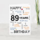 Que seu dia especial seja cheio de alegria, risos e momentos inesquecíveis que você pode apreciar por anos. Desejando-lhe toda a felicidade do mundo no seu aniversário e sempre! Descrição: comemore o notável aniversário de 89 anos com o nosso charmoso cartão de aniversário de 89 anos feliz! Seja para sua amada mãe, pai, querido irmão, ou irmã amada, esta carta oferece uma bela maneira de transmitir seus desejos sinceros e preencher seu dia especial com amor e felicidade. A frente do cartão apresenta "Parabéns" ao lado do número proeminente 89, simbolizando décadas, anos, meses, semanas, dias, horas, minutos e segundos, enfatizando a importância deste marco extraordinário.