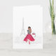 Envie sua correspondência com o talento parisiense. Este cartão é perfeito para qualquer ocasião. Apresenta uma imagem colorida de uma mulher em frente à Torre Eiffel em Paris, França.