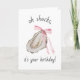 Este cartão de aniversário apresenta um retrato aquoso de uma ostra decorada com um arco rosa.