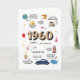 Faça uma viagem de volta a 1960 com este incrível cartão de aniversário cheio de vibrações vintage. Não se trata apenas de uma carta qualquer. É como uma cápsula do mini tempo. Na frente, vocês verão 1960 em letras grandes e ousadas, cercadas por todos os tipos de fatos divertidos daquele ano. Vocês vão descobrir a população dos EUA e do mundo, quanto uma nova casa custa, os preços do gás e do pão, grandes eventos, e até mesmo os nomes de bebês mais populares. É como olhar para o passado. Quer você esteja comemorando um grande aniversário ou apenas queira fazer alguém sorrir, este cartão trará lembranças, rirão, e iniciará conversas de excelente. É pensativo, divertido e cheio de personalidade. É a maneira perfeita de celebrar alguém especial com um retorno ao seu ano de nascimento. Dentro do cartão de aniversário: e muitos, muitos mais!