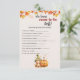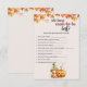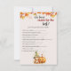 Elevem o entusiasmo no seu Chá de fraldas de outono do Halloween Pumpkin com o nosso cartão de jogo que promete horas de diversão sazonal. Este cartão de jogo foi projetado para adicionar uma camada extra de prazer à sua celebração enquanto adota o espírito da ocasião. Apresentando abóbora e designs inspirados em queda, nosso cartão de jogo se torna uma atividade deliciosa para seus convidados de chá de fraldas. De quebra-gelos a jogos interativos, esta placa melhora o quociente de entretenimento do seu evento. Posicione um chá de fraldas memorável com nosso Cartão de Jogo de Chá de fraldas de Queda de Abóbora de Halloween que combina charme sazonal com atividades interativas. Este cartão não só mantém os seus hóspedes envolvidos, como também contribui para a decoração festiva geral do acontecimento. Atualize o planejamento do seu chá de fraldas com um cartão de jogo que adiciona um toque especial ao entretenimento do seu partido. De impressões fofos de abóbora a motivos de outono, este cartão de jogo se alinha ao tema do seu chá de fraldas.