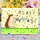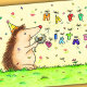 Este cartão de ouriço bonito é excelente de desejar um Feliz Aniversário às crianças! O fundo é amarelo pastel. No primeiro plano, um ouriço fofo, desenhado no estilo de desenho animado, está em pé sobre a grama verde. O ouriço está do lado esquerdo. Está a vestir um chapéu de partido listrado em verde, amarelo e laranja. O ouriço segura um dandélio na mão direita, ele sopra sobre ele. As sementes estão voando pelo ar. São carregandos com eles, um H laranja, um A amarelo, um P vermelho, um P verde, um Y verde claro, um B roxo, um R azul escuro, um T verde, um H roxo, um D laranja, um A cor-de-rosa e um Y amarelo. Juntas estas letras significam "Parabéns".