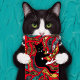Um cartão incomum com um gato flutuando num céu vermelho entre uma carga de peixes estranhos.