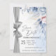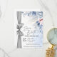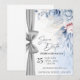 Anuncie seu dia especial com uma elegância atemporal usando este cartão de Save the Date em aquarela de luxo, lindamente projetado com flores em tons de azul suave e rosa e um sutil detalhe de fita prateada.