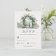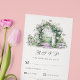 Este design de cartão de casamento RSVP apresenta um arco de jardim floral com uma fonte de água sobre fundo branco e uma tipografia personalizável.