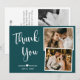 Cartões de agradecimentos de Colagem de Foto de Casamento Branco Elegante, Mínimo, Manuscrito. modelo de cartões de agradecimentos multifoto do casamento na moda com duas (2) fotos na frente e uma (1) fotos no verso. Com o texto "Obrigado" numa bonito letra escrita à mão num script de tipografia em branco sobre fundo verde-negro ou cor turquesa escura. Personalize o nome personalizado e a mensagem do obrigado. Se preferir escrever manualmente a sua nota, basta eliminar o texto de amostra para obter mais espaço. Se precisar de ajuda ou item correspondente, entre em contato com o designer!