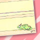 Este cartão é na verdade um pequeno cômico, em três fotos. Na primeira foto, você pode ver um bolo de aniversário do lado esquerdo. É um bolo em camadas, tem glacé rosa e tem uma vela vermelha de bolo de aniversário sobre ele. O bolo está parado no chão marrom, diante de um fundo amarelo. Não há mais nada na foto. A segunda imagem mostra exatamente a mesma cena, só agora, há uma linha rosa indo do bolo para o lado direito da foto. Corre paralelamente ao chão e deixa a moldura à direita, pelo que não podemos ver o que está na outra extremidade. A última imagem revela qual era a linha rosa. É a mesma cena, só que a foto saiu um pouco, então podemos ver que a linha rosa era, de fato, a língua de um camaleão verde, que está vestindo um chapéu de festa, e está se agachando no canto inferior direito do cartão. O bolo à esquerda se foi. A língua do camaleão também não é mais visível, então nós, como espectadores, achamos que o camaleão engoliu tudo. O que explica sua feliz expressão facial.