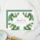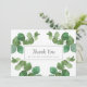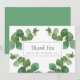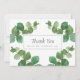Folhas frescas de eucalipto verde enquadram seu agradecimento de casamento com o nome da sua família em tipografia clássica e elegante.