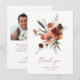 Cartão de agradecimento de casamento boho apresenta um buquê de aquarela de flores em tons de terracota com agradecimento em escrita à mão. Personalize com os nomes do casal e a data do casamento. O verso é facilmente personalizado com sua foto favorita e uma mensagem pessoal