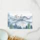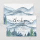 Elegante cartão de agradecimento de casamento com montanhas e cena de floresta em aquarela rústica, apresentando árvores e montanhas azuis e verdes exuberantes com um texto em caligrafia: que a aventura comece. Para aqueles que amam um clima romântico e sonhador de bosque para sua cerimônia e celebração.