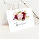 Este cartão de agradecimento de dama de honra tropical e romântico vermelho é perfeito para um casamento de destino. O design artístico bordo marsala apresenta rosas em tons de verde, rosa, burgundy e blush em aquarela, misturadas com folhagens, dispostas de forma elegante e radiante em um buquê de flores.