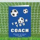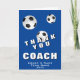 Azul de Futebol da Bola Moderna Obrigado Cartão de Treinador. A placa tem três bolas de futebol preto e branco sobre fundo azul. Cartão de excelente para agradecer treinadores de futebol, treinadores da equipe de futebol de segundo grau, treinadores de mães ou pais, etc. Personalize qualquer texto no cartão. Adicione o nome do treinador, o nome da equipe e o ano.