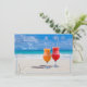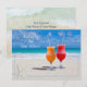Bebidas na praia, cartão de novo endereço com envelopes. Maneira acessível e divertida de contar a todos que você se mudou para o litoral. Coquetéis gelados em vermelho e laranja ficam lado a lado na areia lisa e tropical. Céu azul e água turquesa no horizonte, com uma pequena estrela-do-mar branca, ou pepino-do-mar, decorando o canto inferior. O texto de exemplo é "Anunciando nosso novo endereço". Outra imagem de ondas na costa é o fundo para o texto no verso. Todas as informações estão em forma de parágrafo e são fáceis de personalizar de acordo com as suas necessidades. Mais tamanhos de cartão e melhorias de papel estão disponíveis.