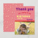 Cartões de aniversário obrigado com fotografia. Você pode personalizá-lo com sua foto e seu nome. O verso do cartão tem um padrão de estrelas amarelas em fundo rosa. Agradeça a todos por virem à sua festa de aniversário.