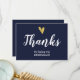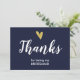 Elegante cartão de agradecimento de casamento com coração de falso foil dourado e letra cursiva branca moderna. A frente e o verso do cartão são em azul marinho chic.