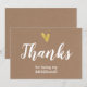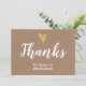 Elegante cartão de agradecimento de casamento com coração de folha de alumínio falso dourado e escrita moderna em branco. A frente e o verso do cartão são em papel kraft falso.