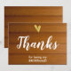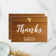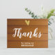 Elegante cartão de agradecimento de casamento em ouro fóil com coração em letra cursiva branca chic. A frente e o verso do cartão são em madeira de celeiro falsa.
