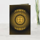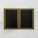 Preto e dourado com uma borda padronizada e um verso com gradiente com um monograma. Este design tem elementos decorativos na frente.
