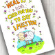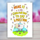 O fundo desta placa é branco. De cima para baixo está escrito "Aqui está um pequeno cartão para você dizer que sinto sua falta". As letras são desenhadas à mão, amarelas e laranja. As palavras são emolduradas com flores pequenas, cor-de-rosa e roxas. Embaixo deles está o desenho de uma ovelha bonitinha, desenhada no estilo de desenho animado. Tem uma flor rosa na boca e está sorrindo para o espectador. Ela está em um campo de grama verde com pequenas flores rosa. Atrás das ovelhas, um céu azul é visível