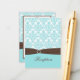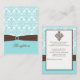 Este cartão de recepção em azul aqua, branco e marrom chocolate com uma fita FAUX e broche cravejado de pedras combina com o convite de casamento mostrado abaixo. Há uma área no verso para incluir as direções para o(s) seu(s) local(is), se necessário. Você pode excluir o texto se não for necessário e abaixar as informações de recepção usando o botão personalizar e clicando em design. Se houver outros itens correspondentes que você precise, por favor envie-me um e-mail com sua solicitação.