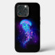 Água-viva grande, azul, desenhada artisticamente, brilhante, brilhante, com longos tentáculos sobre fundo preto com bioluminescência roxa. Água-viva luminosa.