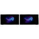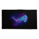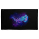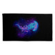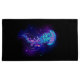 Água-viva grande, azul, desenhada artisticamente, brilhante, brilhante, com longos tentáculos sobre fundo preto com bioluminescência roxa. Água-viva luminosa.