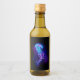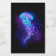 Água-viva grande, azul, desenhada artisticamente, brilhante, brilhante, com longos tentáculos sobre fundo preto com bioluminescência roxa. Água-viva luminosa.