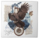 A imagem de uma colagem de águia é uma representação fascinante que combina diferentes elementos e símbolos numa composição artística. No primeiro plano dessa colagem está uma águia voadora majestosa que capta a atenção do espectador. A águia é um símbolo de força, liberdade e majestade e pode servir aqui como um motivo central que ancora o significado da colagem. Outros elementos e símbolos são dispostos em torno da águia. Um anjo reza, que pode representar uma conexão entre o céu e a terra ou elementos espirituais de crença. Isto confere à colagem uma dimensão espiritual e exprime, possivelmente, esperança e proteção. Um relógio antigo na colagem pode indicar a transição de tempo. Esse elemento se refere à ideia de que tudo desaparece e muda com o tempo. Um recorte de jornal amarelado poderia servir como uma metáfora para eventos históricos ou histórias passadas que ainda têm significado no presente. Uma fábrica na colagem pode indicar a indústria e o progresso humano, mas também o impacto ambiental e a alteração da natureza do homem. A combinação de elementos da física poderia apontar para as leis e a ordem naturais no universo que governa nosso mundo. Parece transmitir uma narrativa sobre a conexão entre natureza, tempo, espiritualidade, história e ciência. Os vários elementos são inteligentemente combinados para transmitir uma mensagem rica e complexa que faz o espectador pensar.
